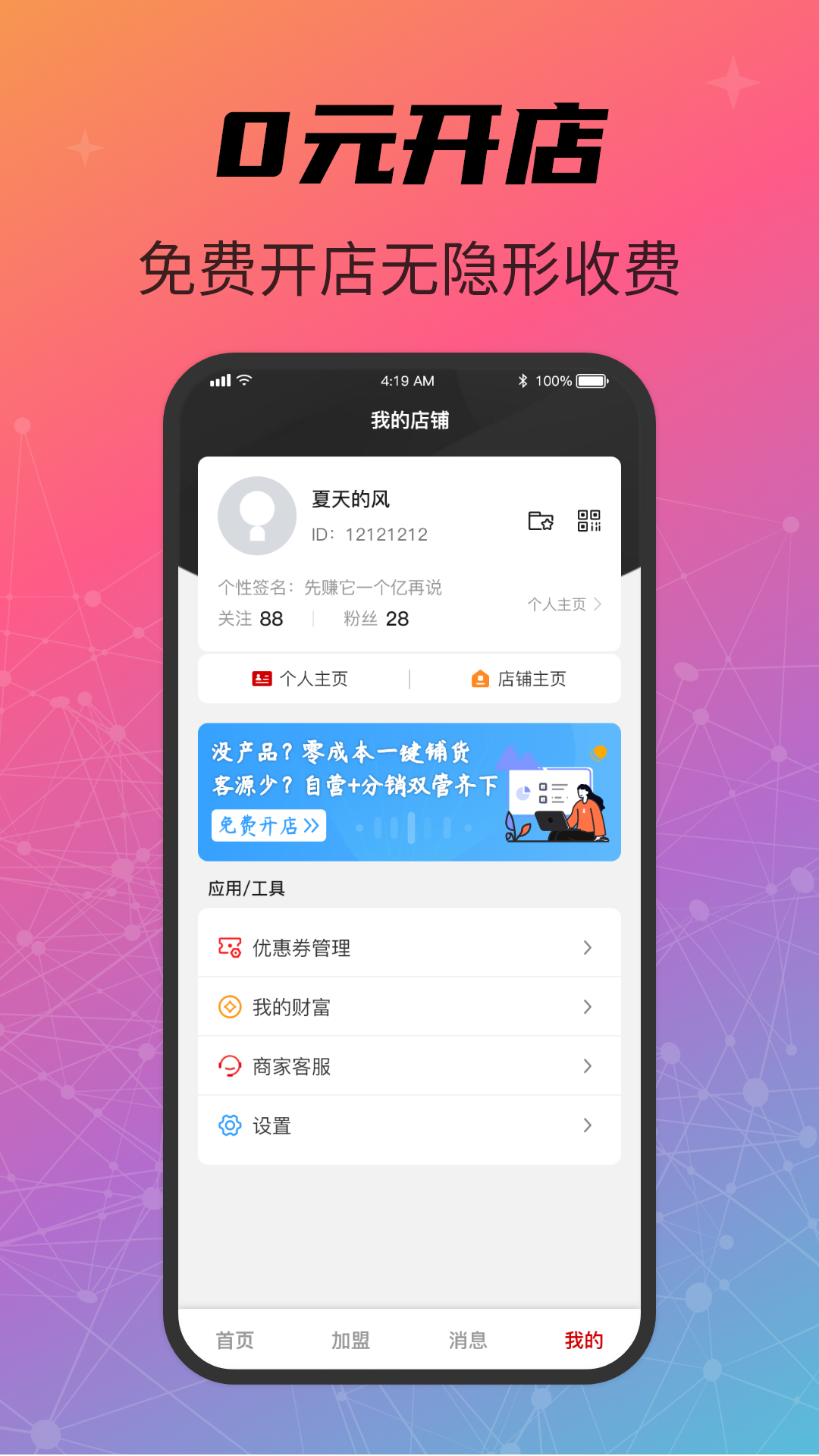 免费开店无隐形费用,注册即享完整开店功能,无任何前期投入压力。