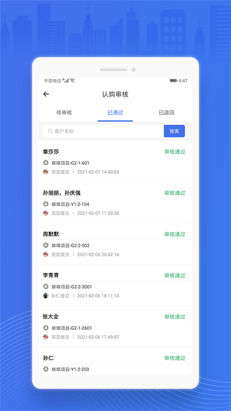 【订单审核】实时审核案场置业顾问录入的客户订单,查看订单详情、客户信息及付款情况,及时发现问题并跟进处理,全面掌控案场销售进度,为销售决策提供数据支持。