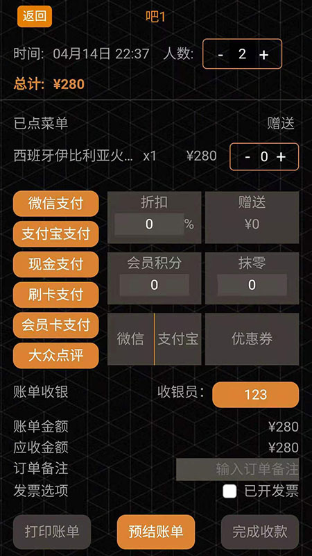 慧收银会点单App提供全方位的餐饮管理功能,包括选桌台点餐、收银结算、小票打印、订单提醒等核心服务。系统支持多人同时操作,实时同步数据,确保订单处理的准确性和时效性。特别适合酒吧、酒店、火锅店、餐馆、咖啡馆、中西餐厅等各类餐饮场所使用。通过智能化的点单流程,大幅提升服务效率,减少人工失误,为商户创造更流畅的运营体验。