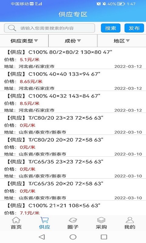 坯布圈app为广大纺织行业从业者提供全方位的专业服务。平台实时更新国际坯布原料行情数据,包括每日价格快讯、市场趋势分析等关键信息。同时汇集了丰富的坯布采购供应信息,涵盖涤棉、全棉、纯涤等多种原料品类。用户不仅可以在这里获取最新的行业资讯,还能通过平台开发潜在客户、推广自家产品。更重要的是,平台搭建了完善的交流社区,让业内人士能够随时进行专业交流,分享经验心得,共同把握市场机遇。