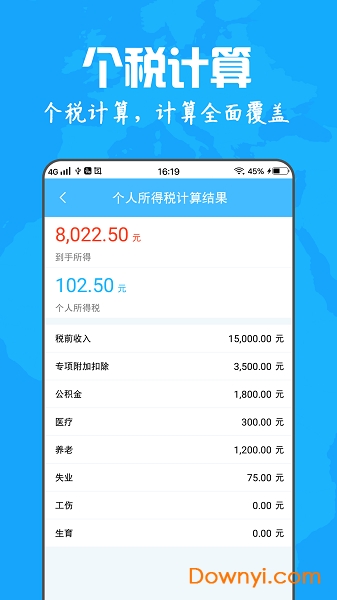4、每月个税缴多少,算一算就知道。系统会根据用户输入的月收入自动计算应纳税额,并显示详细的计税过程和适用税率,让用户明明白白缴税。