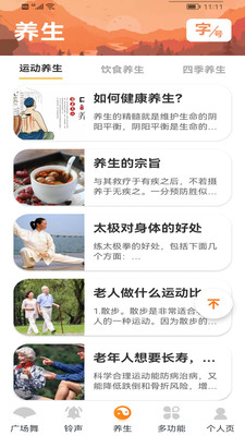 大字版app是一款专为中老年用户打造的贴心资讯平台,采用超大字体和简洁界面设计,让阅读变得更加轻松舒适。在这里,您可以畅享海量精选文章、养生知识和实用生活资讯,所有内容都经过精心排版,确保文字清晰可见。平台还特别提供丰富的手机铃声资源,让您的手机更具个性化。无论是浏览新闻、学习养生知识,还是下载喜欢的铃声,大字版app都能满足您的需求,是老年朋友智能手机使用的好帮手。