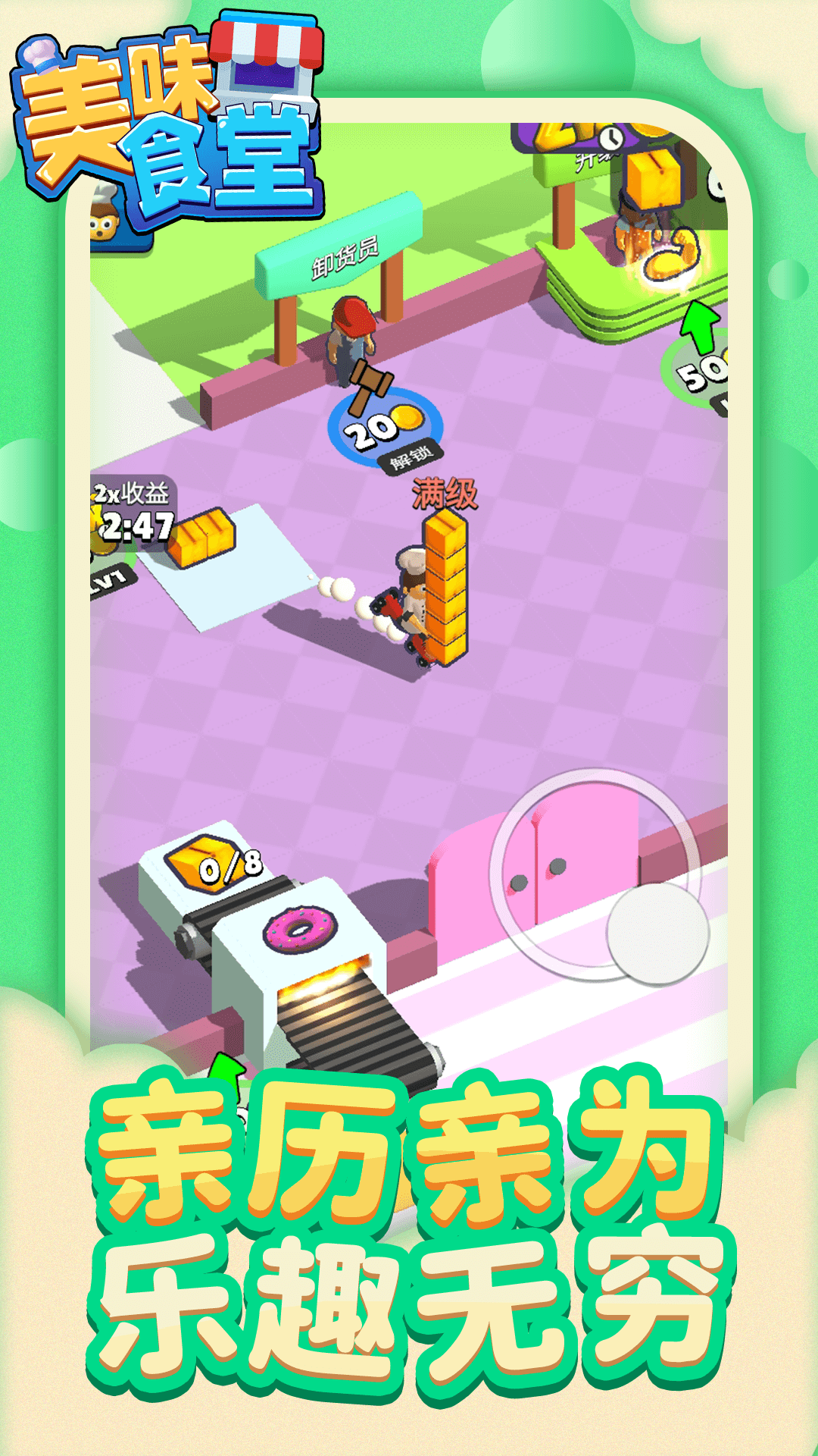 《美味食堂》是一款充满趣味与挑战的餐厅经营模拟游戏,让玩家体验从零开始打造美食帝国的全过程。在游戏中,你将从小厨师起步,通过跑腿送单积累第一桶金,逐步解锁更多餐厅经营玩法。随着收益增加,你可以招聘员工、升级设备,提升出餐和送餐效率,吸引更多顾客并获得好评。游戏融合了美食制作、餐厅管理和策略经营等元素,让你在轻松愉快的氛围中感受创业的乐趣。无论是研究新菜谱还是应对不同顾客的需求,每个环节都充满惊喜与成就感。