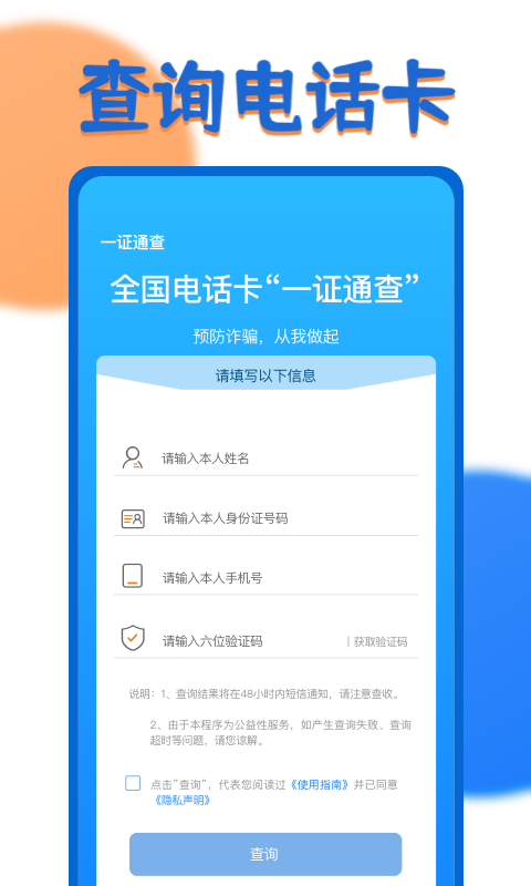 - 查询电话卡,一键查询名下电话卡:通过简单的身份验证流程,即可快速获取个人名下所有电话卡的汇总信息,支持按运营商分类查看,操作便捷高效。