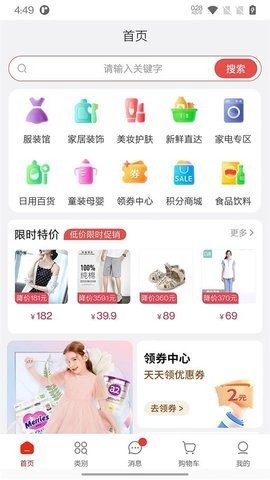 2、打开软件首页,你会看到非常丰富的功能;首页采用智能推荐算法,会根据您的浏览记录和购物偏好展示个性化商品。顶部设有活动专区入口,中部是分类导航区,底部则是常用功能快捷入口,界面设计简洁明了。