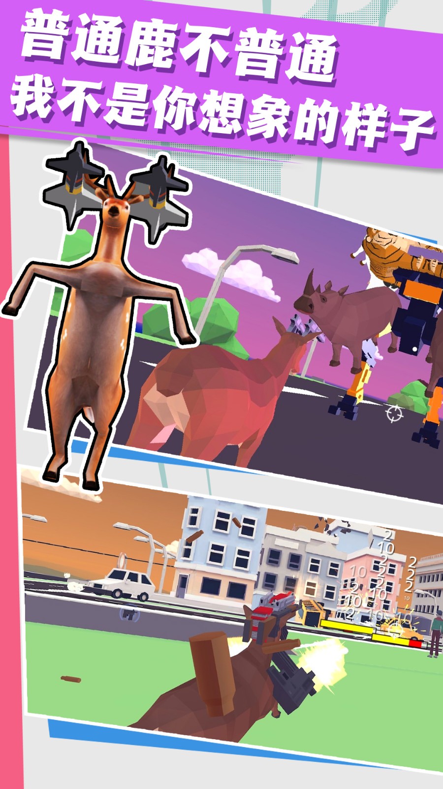 3、创新的角色操控系统让玩家能精准控制这头"凶残"的小鹿,从基本的冲撞到复杂的特技动作都能流畅执行。随着游戏进程,还能解锁喷气背包等夸张装备,体验真正的"无法无天"。