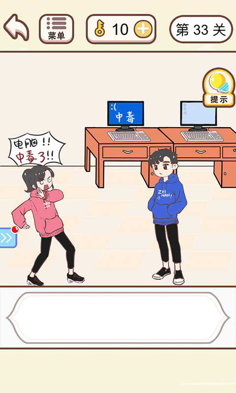 第五关:在第一场景中先点击柜子打开,发现里面的键盘并拾取。切换到第二场景后,将键盘交给男主角使用。