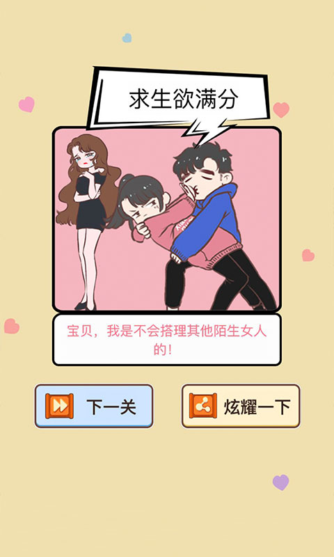 《求生欲破解版》是一款趣味十足的休闲解谜闯关游戏,专为测试玩家在恋爱关系中的情商与应变能力而设计。游戏以情侣日常相处中常见的"送命题"为关卡主题,通过一系列精心设计的两难情境,考验玩家在面对女友刁钻提问时的机智反应。从处理前任突然联系到应对绿茶妹的刻意接近,每个关卡都源自生活却又充满戏剧性。玩家需要在限定时间内做出最佳选择,用高情商回答化解危机,否则就可能面临"被分手"的悲惨结局。游戏采用轻松幽默的表现手法,让玩家在欢笑中学习恋爱相处之道,同时还能通过评分系统直观了解自己的"求生欲"水平。