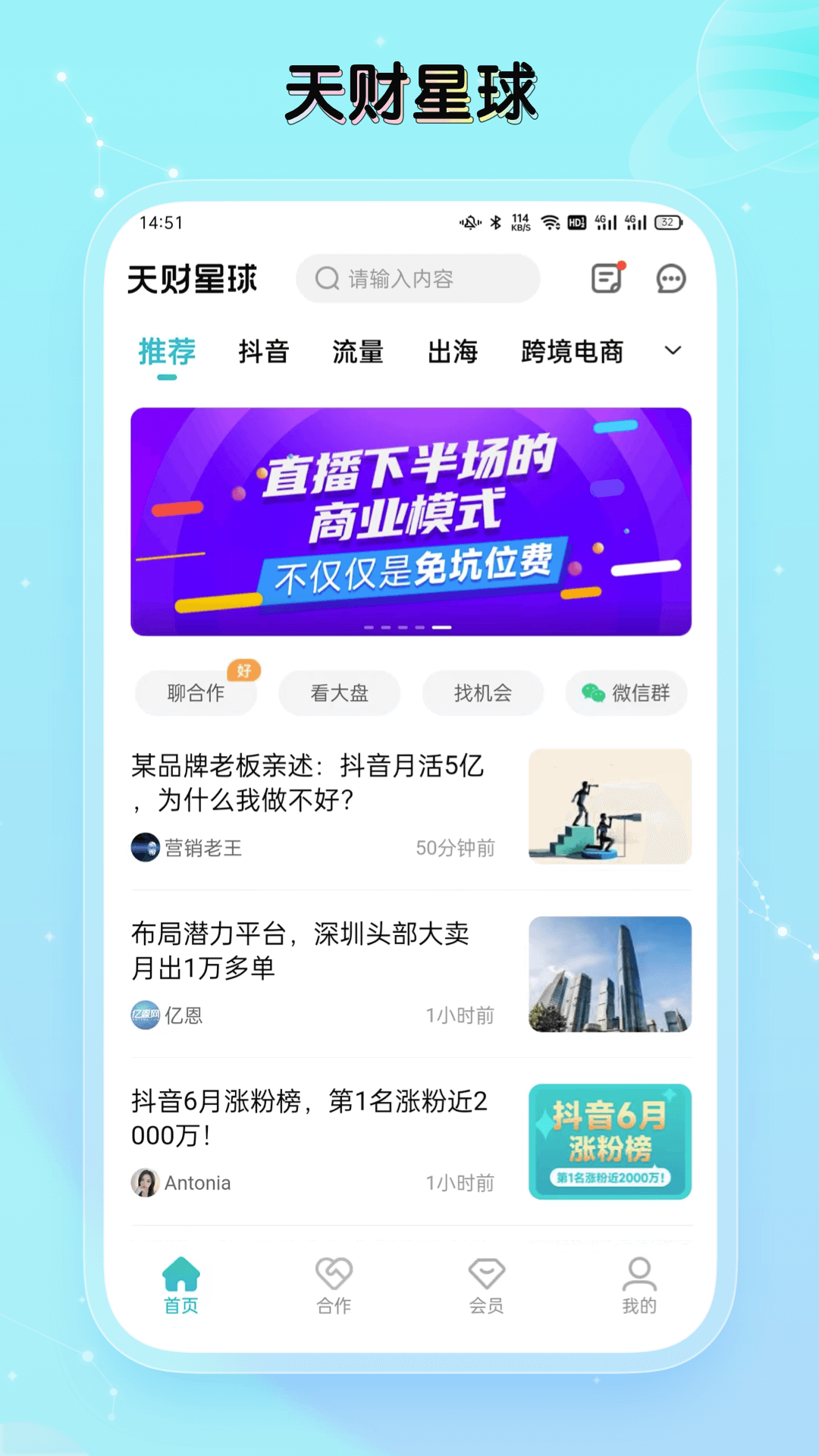 天财星球APP是一款专为创业者打造的高端学习交流平台,致力于为用户提供优质的行业资源和成长机会。在这里,您可以获取前沿的行业知识,掌握最新的市场动态,拓展有价值的商业人脉。平台汇聚了众多成功创业者,既有月入百万的行业新秀,也有年利润千万的资深大咖。无论您是寻找项目灵感、学习流量打法,还是探索国内外市场机遇,天财星球都能为您提供专业支持。现在就下载APP,开启您的创业进阶之旅!