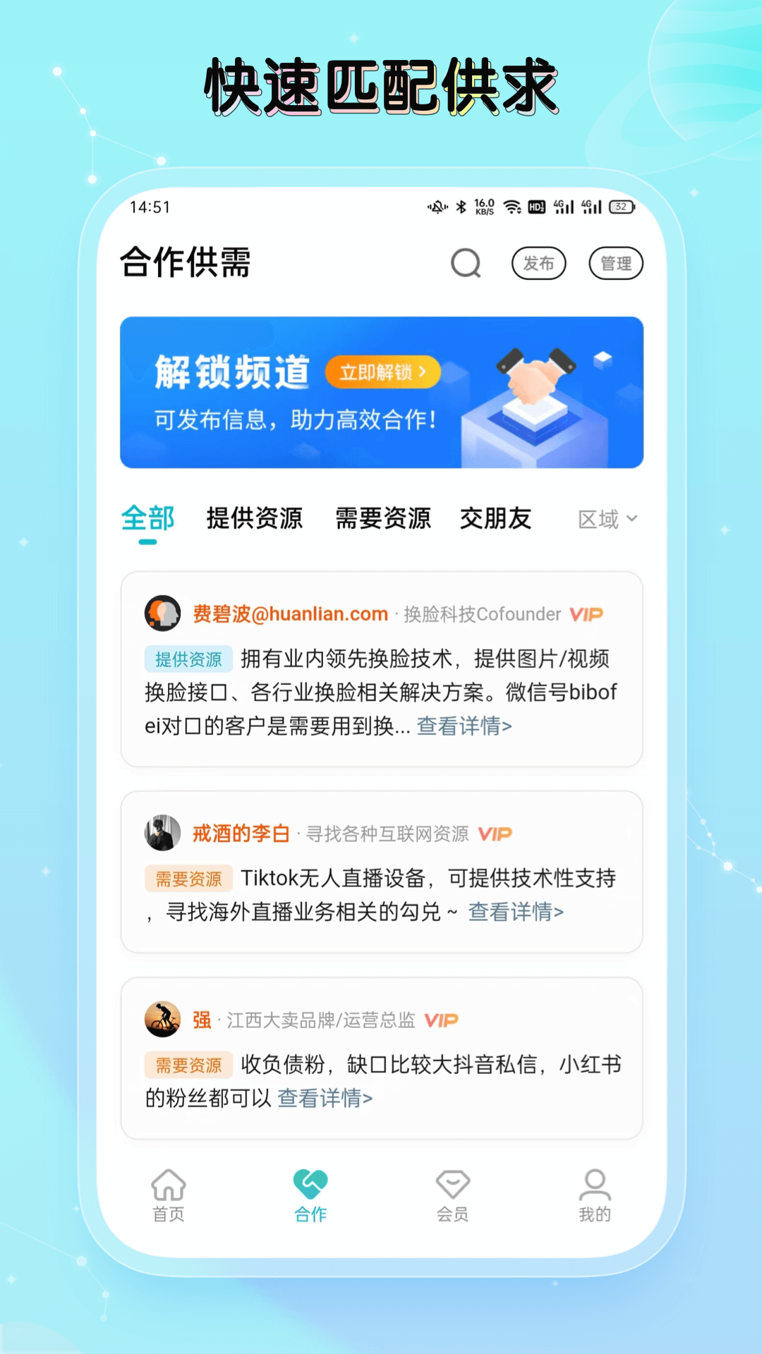 文章模块:平台精心打造了专业的内容板块,涵盖行业趋势分析、商业模式解读、营销策略分享等优质内容,帮助用户系统性地提升商业认知。合作模块:通过智能匹配系统,用户可以高效发现潜在商业伙伴,对接优质项目资源,平台还提供专业的合作指导服务,助力商业合作顺利达成。会员服务:平台建立了完善的会员体系,为不同阶段的创业者提供个性化的发展建议和资源支持。