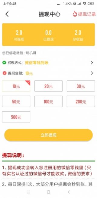 收益满10元可提现,支持提现在微信钱包上,提现24小时内到账;平台承诺提现零手续费,节假日照常处理。新用户注册即可获得1元体验金,完成新手任务还能额外获得5元奖励金。