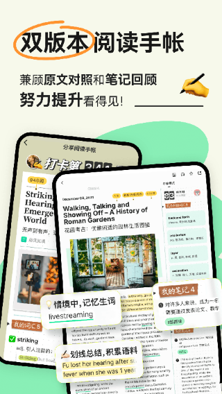 2、深度整合扇贝单词记忆引擎,阅读中标记的生词会自动同步到背词计划。系统通过跨平台数据互通,确保每个单词在不同场景下重复出现7-12次。