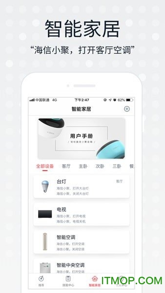 -智能家居:只需说出"海信小聚,打开客厅空调",就能远程控制家中的智能设备,实现全屋家电的语音操控。