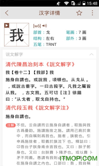 本字典在此基础上对《说文解字》进行重新排版和编辑,简洁、快速、准确、详细是本字典的亮点。本字典支持多种查询方式:按部首查、按拼音查、智能查词等;每个汉字都包含了详细的解释,如拼音、五笔、笔划、部首、结构等;精心编写释义,汉字注释引用《说文解字》原文例证,准确;按读音、词性分类出释义、方便查阅。