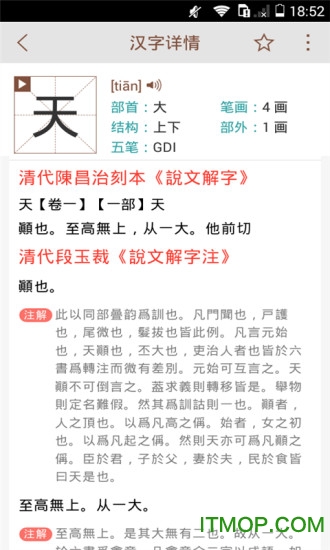 作为中国首部按部首编排的字典,《说文解字》开创了汉字检索的先河,其540部首分类法和9353字的收录规模影响深远。本应用不仅完整保留了这一经典编排体系,还创新性地加入了多种现代化查询功能。用户可以通过部首、拼音、笔画等多种方式快速定位目标汉字,每个字条都包含拼音标注、五笔编码、笔顺动画、部首解析等详细信息。特别值得一提的是,所有释义都严格参照原著,并辅以丰富的例证说明,确保内容的权威性和准确性。应用还贴心地按照读音和词性对释义进行了分类整理,极大提升了查阅效率。