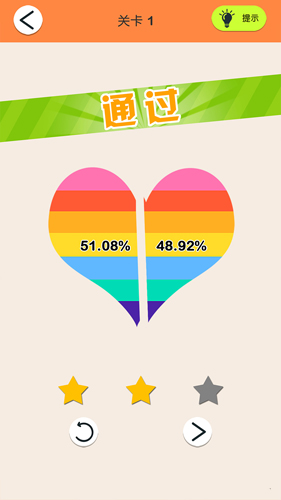 3、成功完成切割后,点击【下一关】按钮,进入下一个关卡继续游戏。三星通关会解锁专家模式,在该模式下图形会持续旋转增加挑战难度。每周更新的限时挑战关卡提供独特的多层切割玩法,完成可获得稀有刀具奖励。