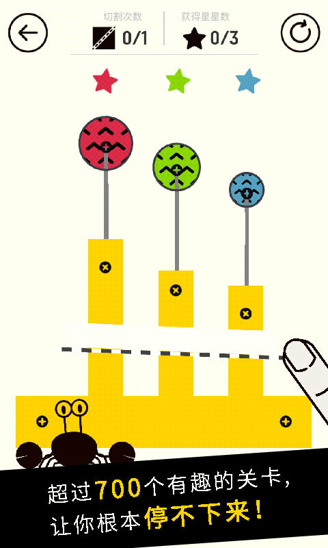 游戏融入了牛顿力学等物理学元素,玩家需要运用重力、惯性等物理知识来完成切割任务。这是一场脑力与精准度的双重考验,只有合理运用物理原理才能顺利通关。游戏包含700多个精心设计的关卡,难度从简单到复杂循序渐进,满足不同水平玩家的挑战需求。每个关卡都有独特的设计理念,让玩家在解谜过程中不断获得成就感。丰富的关卡内容保证了游戏的长久可玩性。