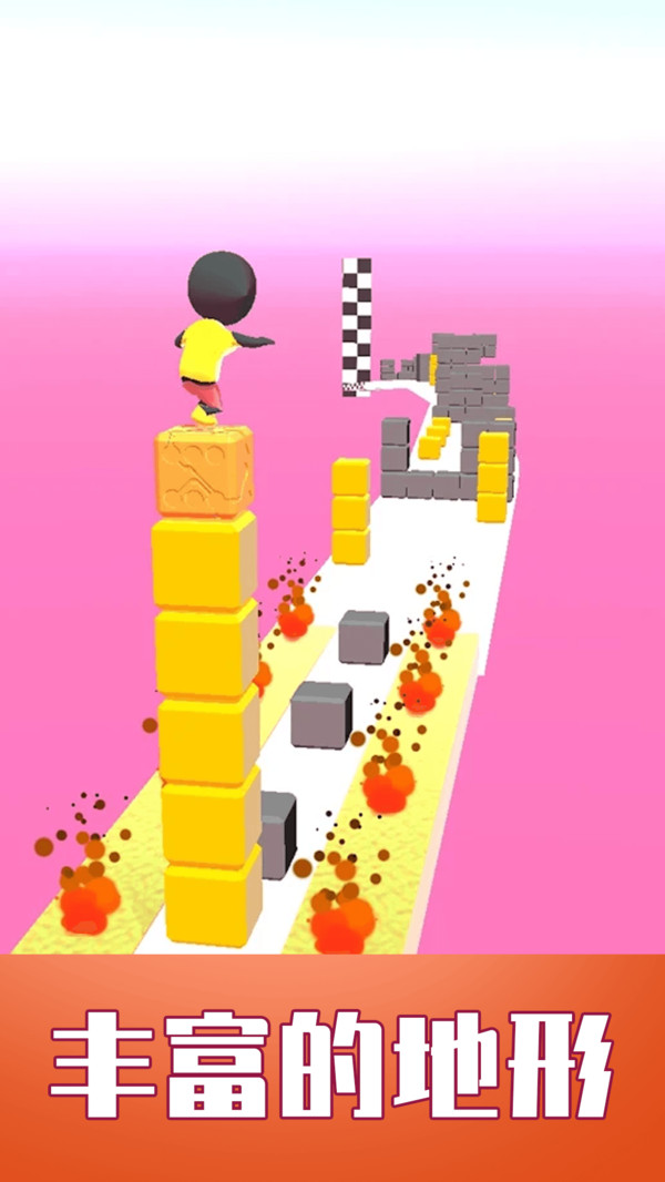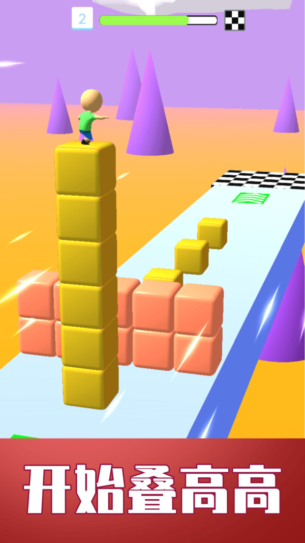 3、方块叠得越高,越能轻松跨越大型障碍物,这种正向反馈机制激励玩家不断挑战自我极限,同时也要注意保持平衡,避免因堆叠过高而导致失控。