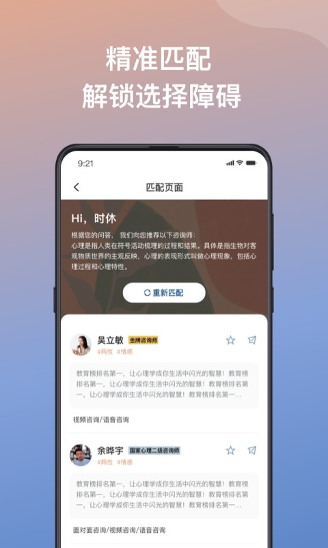 1、其中推荐课程;我们只是汲取经验丰富的咨询师;平台提供智能匹配系统,可根据用户的具体情况推荐最适合的咨询师。2、能够解决实际的心理问题,是我们最大的心愿;平台支持多种咨询方式,包括即时文字咨询、语音通话和视频咨询,满足不同用户的需求。3、我们的平台没有广告,没有提供任何课程学习和其;保持纯净的咨询环境是我们的承诺。4、他评测,也不介绍课程,更不会在心理咨询的过程;我们专注于提供专业的心理咨询服务,不涉及任何商业推广。