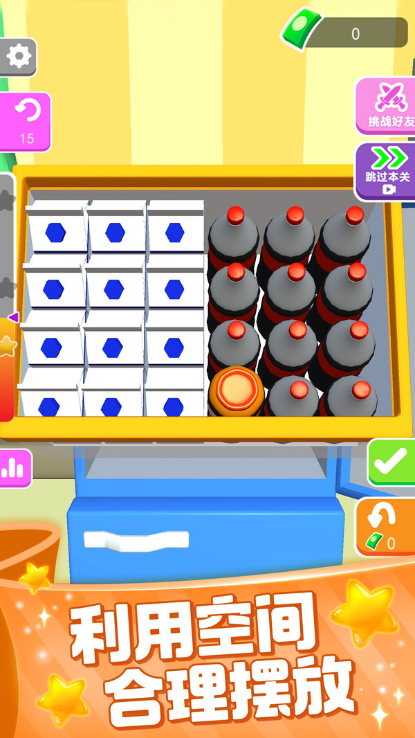 2、独特有趣的挑战,放置乱七八糟的物品,合理规划,完成任务,发挥储物实力!游戏特别加入了"完美收纳"评分机制,根据空间利用率给予星级评价,激励玩家追求更优解决方案。