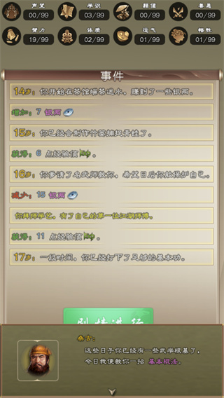 4、正式进入游戏后,点击"下一年"按钮推进游戏进程,系统会自动生成这一年的江湖经历;
