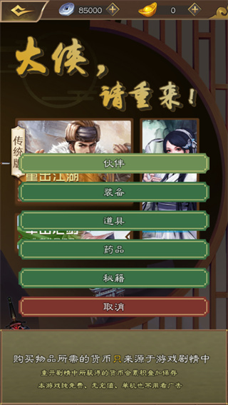 《大侠请重来》是一款以武侠江湖为背景的文字剧情类游戏,玩家将在这个充满机遇与挑战的世界中书写自己的传奇人生。游戏提供三种模式:重出江湖、华山论剑和剧情模式,其中"重出江湖"是核心玩法。玩家开局需要选择天赋并分配属性点,随后通过文字描述体验江湖生涯中的各种奇遇。游戏采用年度推进机制,每一年都需要手动点击进入,系统会详细记录这一年发生的所有重要事件,包括拜师学艺、江湖恩怨等。虽然玩法与同类游戏相似,但加入了独特的机遇选项和战斗系统,让游戏体验更加丰富。本次推出的破解版锁定银两数量,让玩家可以尽情享受无忧无虑的江湖生活。
