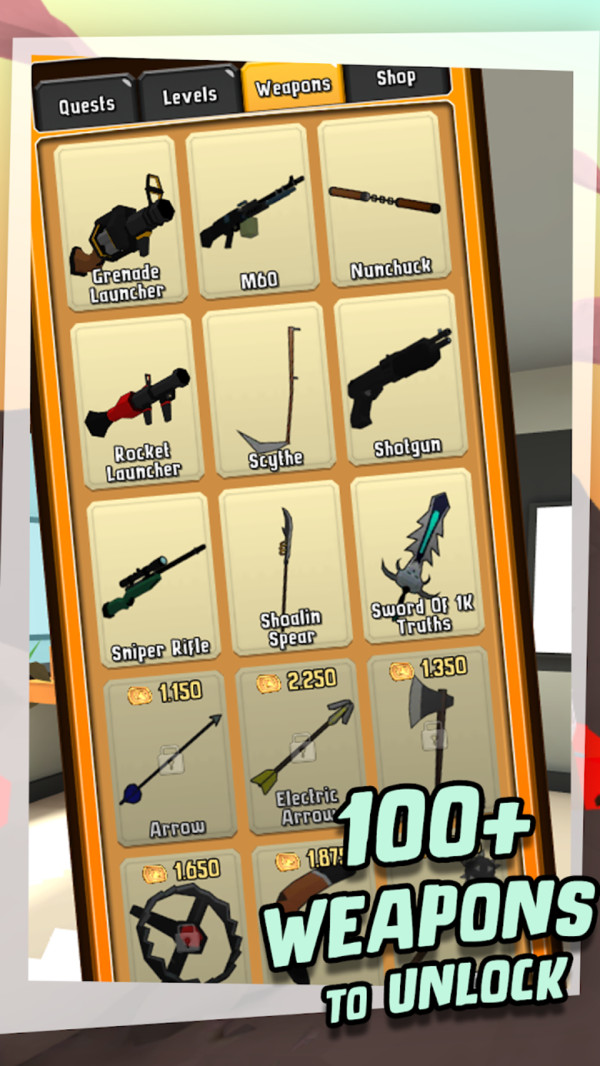 3、武器系统丰富多样,除了通过成就解锁外,还可以在游戏商城中用金币购买,各种奇葩武器等你来收集,满足不同玩家的战斗偏好。
