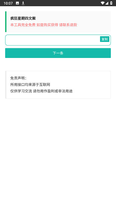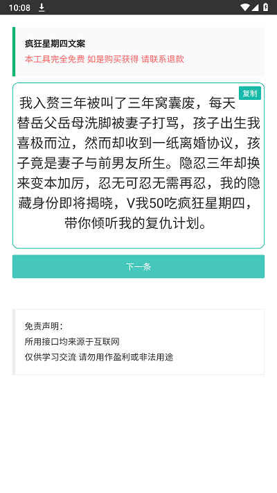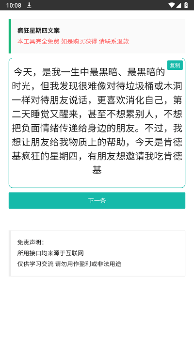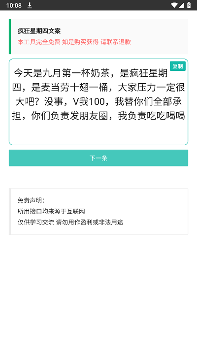 疯狂星期四文案生成器是一款专为社交娱乐打造的创意文案工具,让你在每周四的狂欢时刻不再词穷。无论是朋友圈互动还是好友私聊,这款应用都能为你提供海量幽默风趣的文案素材。软件内置智能算法,每次刷新都会推送不同风格的文案,从搞笑段子到网络热梗应有尽有。特别设计的"v我50"特色模板更是让互动充满惊喜,用户可以通过不断尝试找到最符合心意的文案,让每个星期四都充满欢乐。