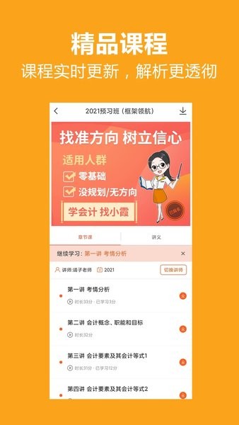 3、优质课程:所有课程均由资深会计专家和一线教师团队精心设计,内容涵盖理论知识和实务操作。课程体系完整,讲解深入浅出,既适合零基础学员入门,也能满足进阶学习需求。定期更新的课程内容确保与最新考试大纲保持同步。
