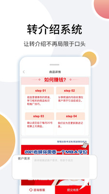 【营销社区】汇聚行业干货,涵盖营销技巧、兼职指南及垂直领域专业知识,助力用户持续成长;【赚钱频道】整合转介绍、裂变推广及兼职任务,提供多样化创收路径;【转介绍系统】通过标准化工具将传统口头推荐升级为数字化营销;【任务系统】支持兼职创作、推广等灵活就业形式;【自助提现】佣金实时到账,支持随时提现,资金管理更自由。