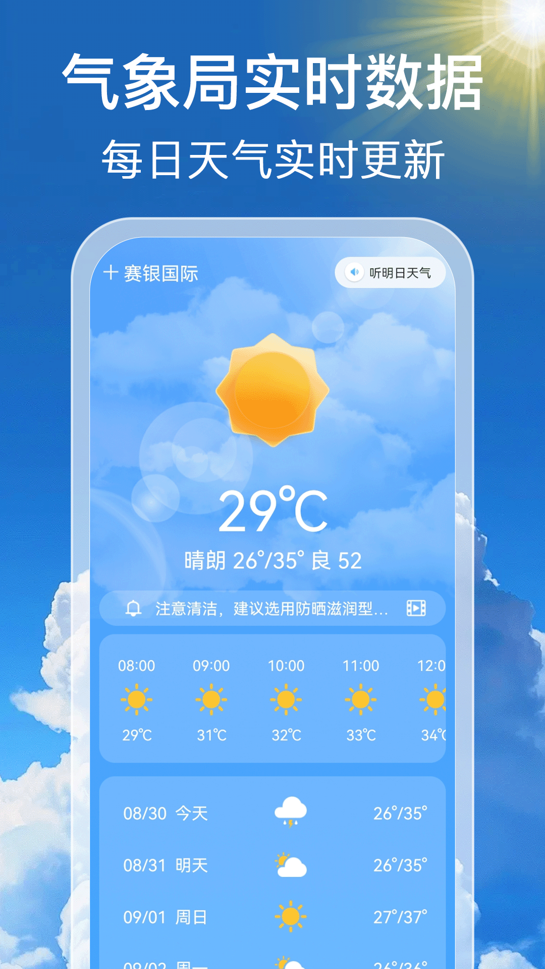想要随时掌握天气变化,提前做好出行和生活安排吗?这款天气应用为您提供精准的天气预报服务,无论是晴天、雨天还是降温天气,都能及时提醒您做好准备。通过实时更新的气象数据,您可以查看未来24小时乃至一周内的天气趋势,包括温度、湿度、风速等详细信息。此外,应用还提供穿衣建议、紫外线指数等贴心功能,让您的生活更加便捷无忧。无论是上班通勤、户外运动还是旅行计划,都能根据天气情况做出最佳选择。