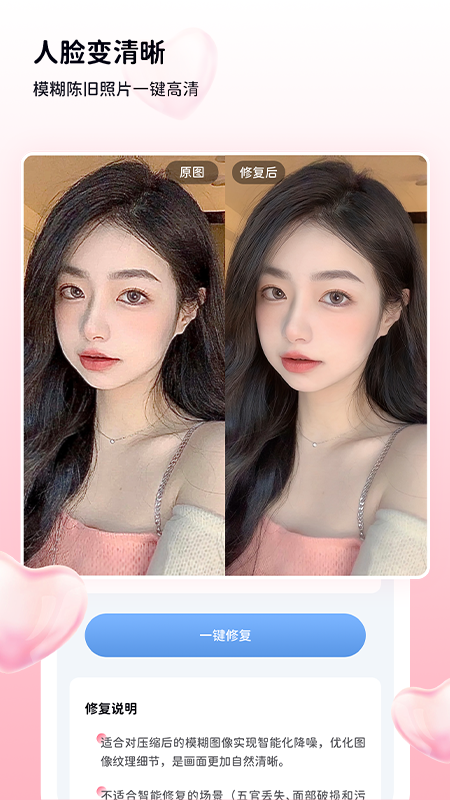 悦颜美图修图是一款由国内专业技术团队倾力打造的多功能修图软件,致力于为用户提供高效便捷的图片处理解决方案。它不仅具备基础的图片美化功能,还融入了AI智能技术,能够自动识别照片中的瑕疵并进行精准修复。无论是人像磨皮、美白,还是背景虚化、色彩调整,都能轻松完成。此外,软件还内置了丰富的滤镜和特效模板,让用户无需复杂操作即可获得专业级修图效果。无论是社交媒体分享还是个人收藏,悦颜美图修图都能帮助您轻松打造高质量图片,成为您生活中的美图小助手。