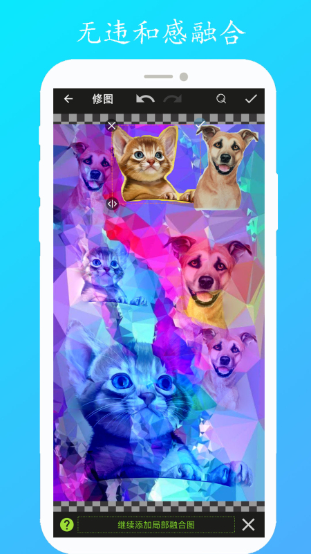 3、【融合】采用智能色彩匹配算法,实现图片叠加融合功能。融合图会根据背景图的色彩自动调整,达到自然和谐的视觉效果。支持透明度调节,让图片叠加更加灵活多变。