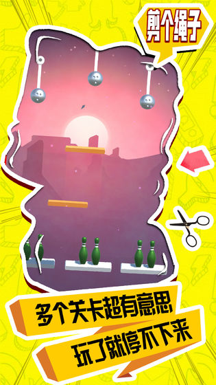 《剪个绳子》是一款充满创意与挑战的休闲闯关游戏。玩家需要在恰当的时机剪断绳子,让悬挂的保龄球精准落下,击倒所有瓶子才能顺利通关。随着关卡推进,游戏难度逐渐提升,绳索摆动幅度、障碍物位置等变化将考验你的反应力和策略思维。简洁明快的画风搭配轻松音效,带来愉悦的游戏体验,适合利用碎片时间放松解压。