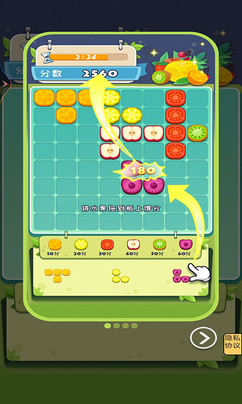 游戏操作简单直观,点击图标即可进入游戏,选择心仪关卡开始挑战。通过拖动水果进行连线,当三个或以上相同水果连成一线时即可消除。消除的数量越多,获得的分数就越高,超过三个以上的消除会生成特色水果,这些特色水果拥有特殊能力,能帮助玩家更轻松地完成关卡目标。游戏还设有每日任务和成就系统,让玩家在挑战中不断获得惊喜和成就感。精美的画面设计和流畅的操作体验,让《水果哒哒哒》成为休闲娱乐的绝佳选择。
