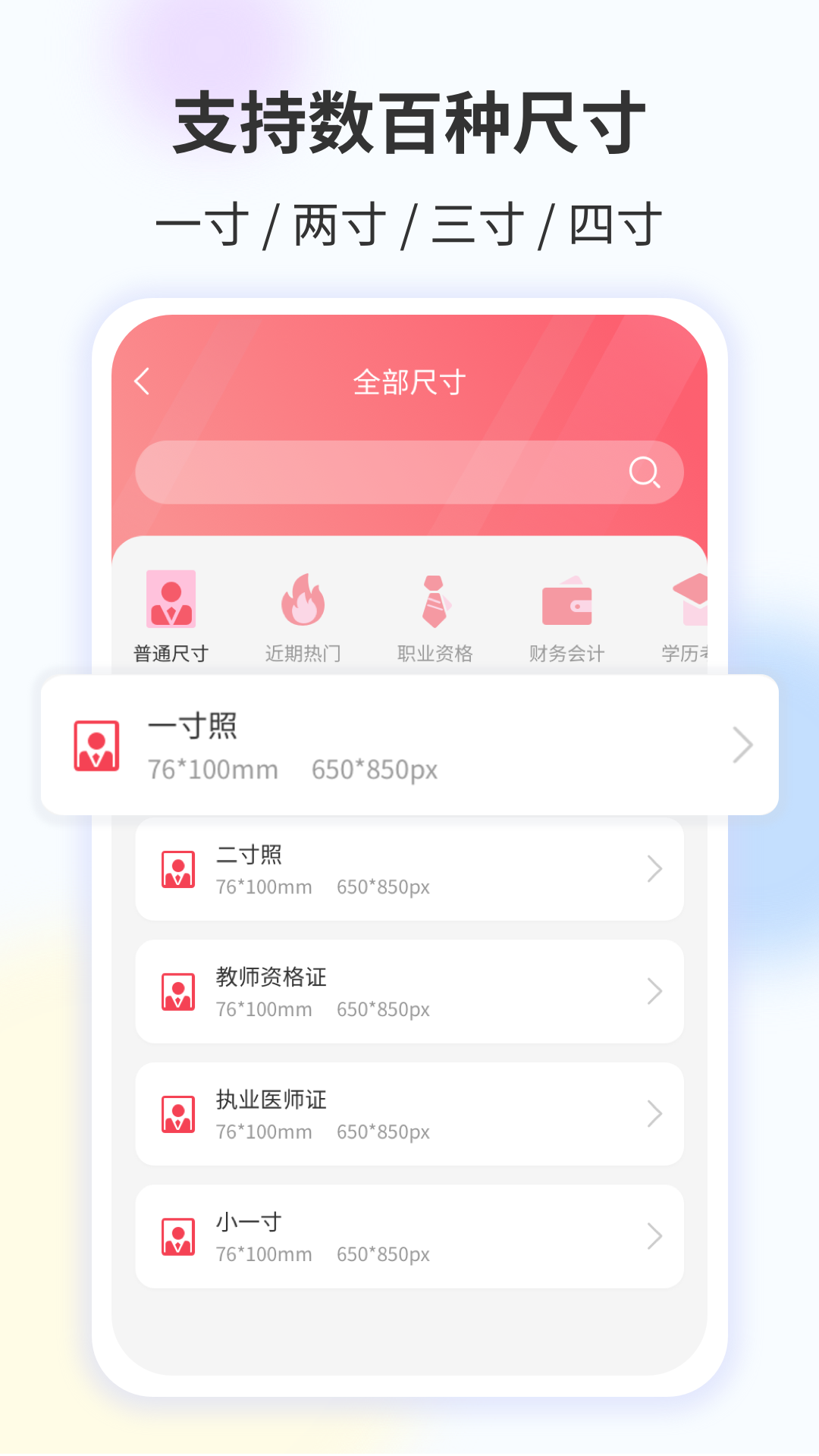 涵盖各类报考:考试、研究生报考、教师资格证、会计资格证报考、成人等学历考试、计算机等级考试、英语四六级、普通话水平测试等语言考试,导游证等上百种资格类考试证件照。针对不同考试要求,APP会智能匹配对应的着装规范、表情要求和背景颜色。例如公务员考试需要的正装照、艺考需要的艺术照等,都有详细指引。还会根据考试时间节点推送提醒,避免错过报名截止日期。