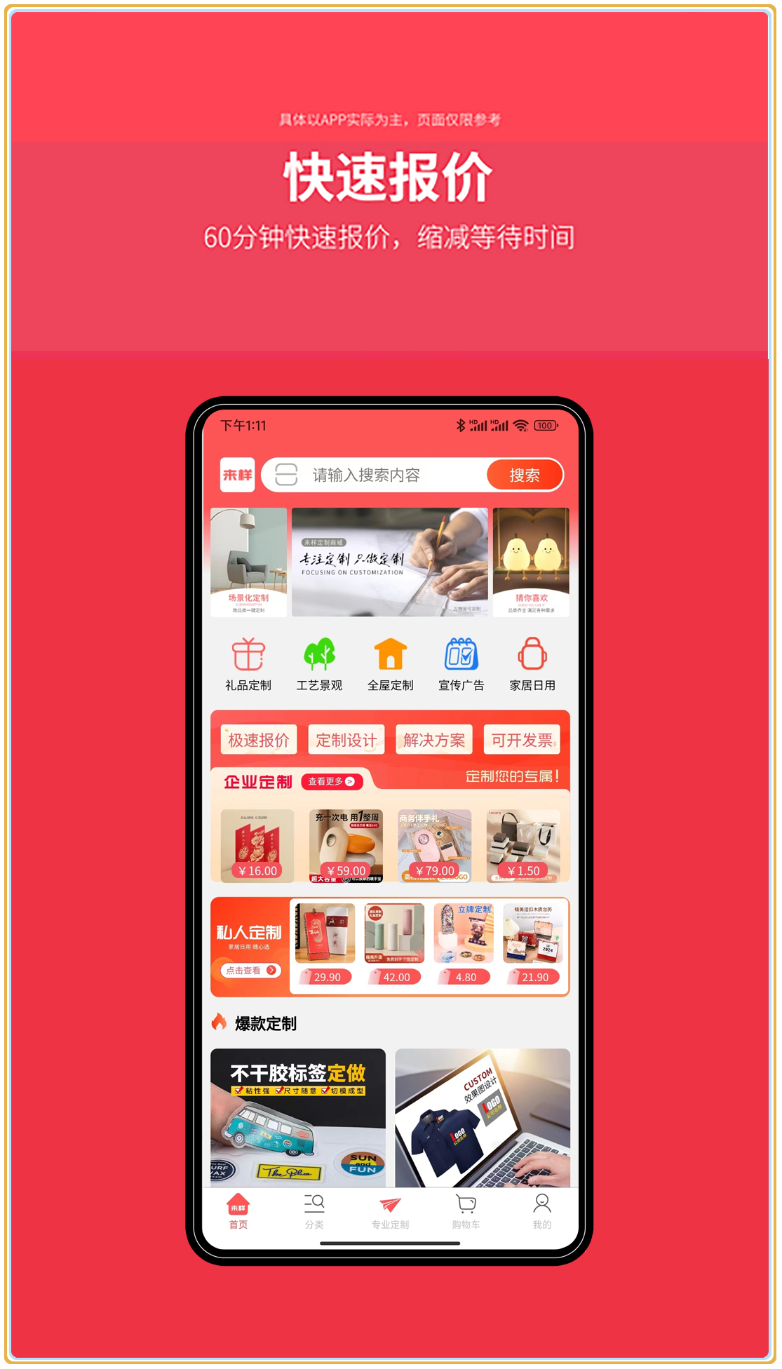来样app,专注于各类产品的定制,满足不同用户的个性化需求,产品覆盖各种工业品门类。都是"来样"品牌,质量有保证。
