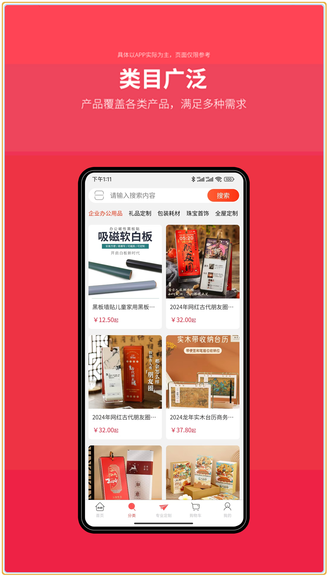 平台产品类目持续扩充中,目前已覆盖20多个行业领域,3000多种细分产品。每个品类都有专业的产品经理把关,确保定制方案的专业性和可行性。用户可以根据实际需求选择标准产品或提出个性化定制要求,平台将提供专业的设计建议和技术支持。