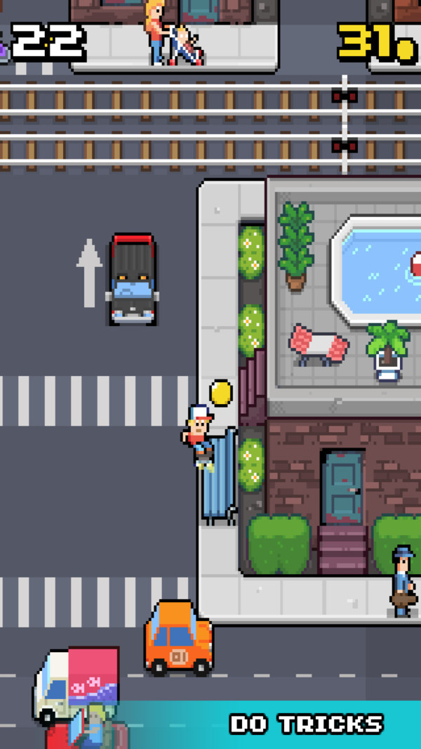 游戏中你可以踩着像素滑板自由穿梭于城市街道,尽情展示各种花式动作。通过不断练习,你可以从新手成长为职业滑板选手,与好友展开激烈竞争。这款游戏完美融合了滑板运动和像素艺术,为喜爱这两种元素的玩家带来双重享受。在城市街道中滑行时,你需要完成ollie等专业动作,挑战更高难度的技巧组合。街道上布满了各种障碍和陷阱,需要你运用闪避、跳跃等技巧来应对,同时还要收集商店里的特殊角色。游戏的像素画面精致细腻,充满怀旧气息。