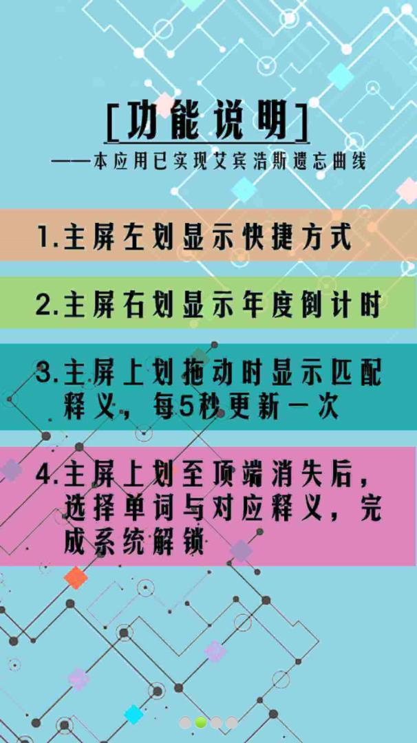 本应用在完整模仿传统课堂记忆模式的前提下,严格遵循艾宾浩斯(H.Ebbinghaus)遗忘曲线的记忆规律进行开发,通过神经语言学原理优化记忆路径。系统会根据用户的学习进度和记忆效果,智能调整复习频率和难度,确保每个单词都能形成长期记忆。应用还特别设计了多种记忆场景,包括晨间速记、睡前复习等,充分利用大脑不同时段的记忆特点。通过语音识别和即时反馈功能,帮助用户纠正发音错误,实现听说读写全方位提升。使用时请先开启浮窗权限,并在电源管理中开启手动权限,随后即可在设置界面开启锁屏模块。