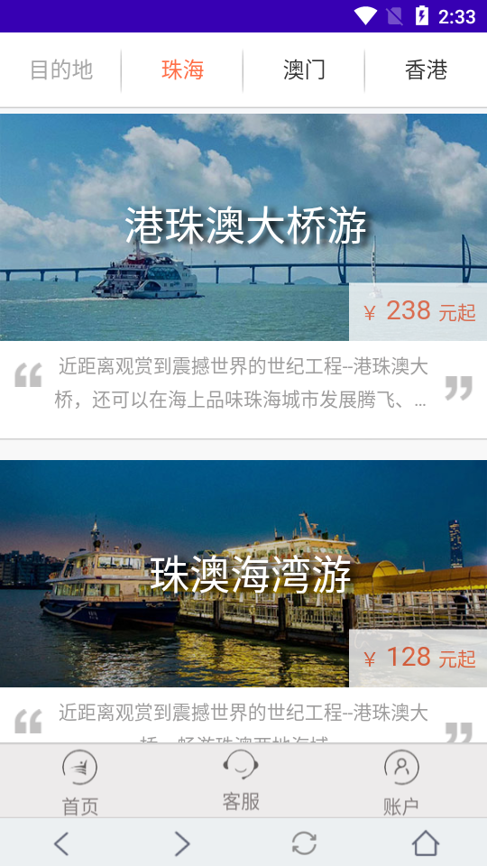 平台提供全面的票务服务功能,包括珠海长隆主题乐园门票、周边海岛游船票预订。特色服务涵盖港珠澳大桥观光、港澳地区专车接送等跨境旅游项目。每逢珠海航展期间,平台将开通专属购票通道,确保用户第一时间获取入场资格。所有票务资源均与官方直连,价格透明,出票迅速,让您享受便捷安心的购票体验。