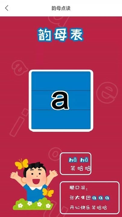 2. 趣味十足的拼音启蒙课程,包含完整的声母表、韵母表和整体认读音节表,配合记忆口诀和韵律儿歌,让学习充满乐趣。