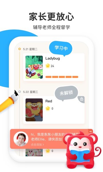 专业辅导团队提供全流程学习陪伴,从课前预习指导到课后复习巩固,形成完整的学习闭环。辅导老师会定期与家长沟通,详细反馈孩子的学习情况,并根据测评结果调整学习计划。平台还提供丰富的家长课堂和育儿指导,帮助家长掌握科学的启蒙教育方法,共同促进孩子健康成长。