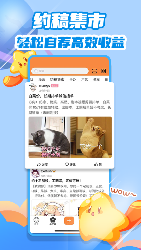 分享二次元伙伴的生活日常,见闻、随手拍摄,结识共同兴趣的同好,点燃你心中的热爱!我们提供丰富的贴纸、滤镜和编辑工具,让你的分享更加生动有趣。无论是漫展打卡、手办收藏,还是日常生活中的二次元元素,都可以在这里找到共鸣。独特的"同城漫友"功能还能帮你发现身边志趣相投的小伙伴,让二次元生活不再孤单。