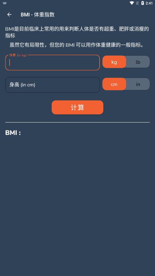 * 内置BMI计算器,支持公制和美国两种单位系统,帮助用户科学评估身体状况。