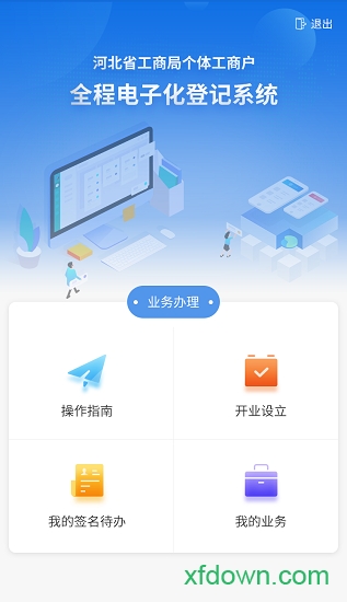 第二步:主界面设计简洁明了,设有"操作指南"视频教程、"个体设立"快速入口、"我的业务"进度追踪等核心功能模块。