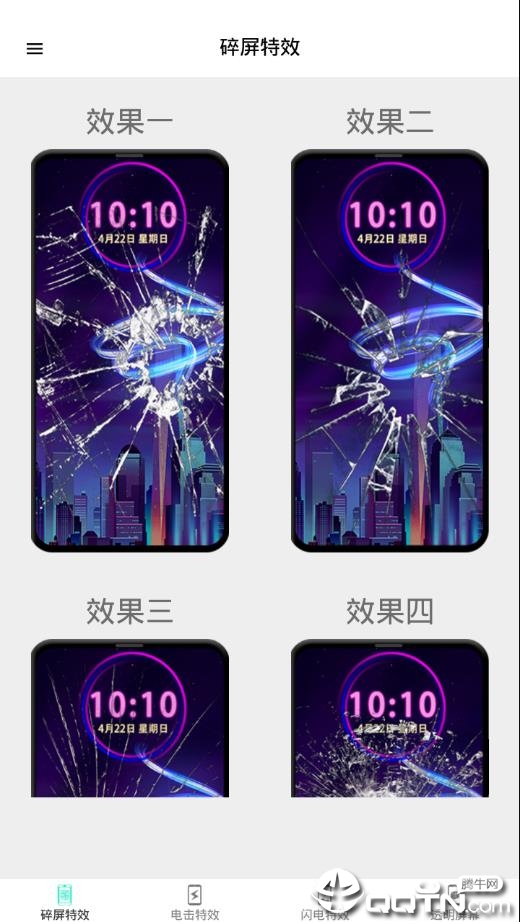 开启点击屏幕之后,用手指触碰手机屏幕,可以模拟手机屏幕碎裂特效。提供多种裂纹样式可选,包括蛛网式、放射状等不同破碎效果。特效支持3D立体显示,配合重力感应还能实现碎片动态掉落的效果,逼真度极高。