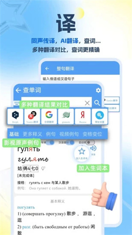 1、单词查询功能强大,支持模糊搜索和联想输入,提供详细的释义、例句和发音,是学习俄语的好帮手。