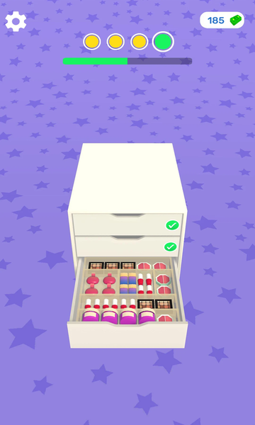 --游戏玩法新颖独特,玩家必须将桌面上的化妆品按一定的顺序进行整理并放在柜子里。系统会根据整理效率和空间利用率给出评分,激励玩家追求完美收纳