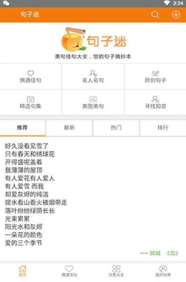 2、智能推荐系统,每日根据用户喜好推送精选句子,包含热门推荐、最新发布、排行榜等多种展示形式;